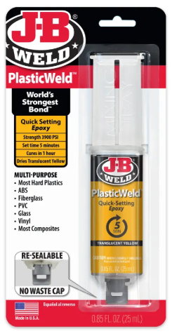 A Plastic Weld™ egy speciálisan kifejlesztett kétkomponensű ragasztó és epoxy töltőanyag rendszer, amely erős és tartós javításokat biztosít. A Plastic Weld™ számos felületet képes ragasztani, kemény műanyagokat, fémet, kompozitokat, üvegszálat és egyebeket. A Plastic Weld™ szobahőmérsékleten 5 perc alatt köt, és 1 óra alatt teljesen kikeményedik. 1:1 keverési arányban a Plastic Weld™ 3900 PSI szakítószilárdságúvá válik, és átlátszó sárga színűre köt. Hőtűrés: 121 Cels. fok.